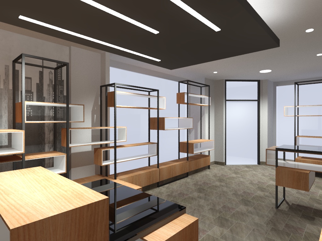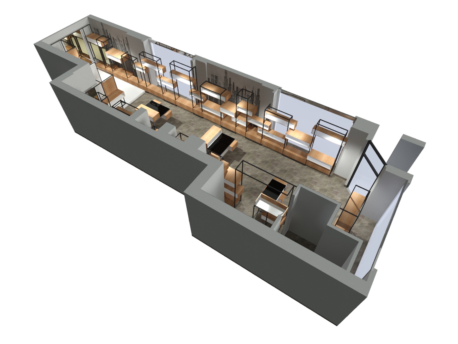 Studio di massima ristrutturazione ed allestimento negozio di abbigliamento. Nuova immagine wireframe da realizzarsi in profili scatolari in ferro e contenitori il legno con rivestimento interno in adesivo bianco. La scansione degli elementi riprende lo skyline urbano con corpi aggettanti pieni e vuoti.