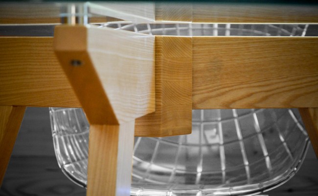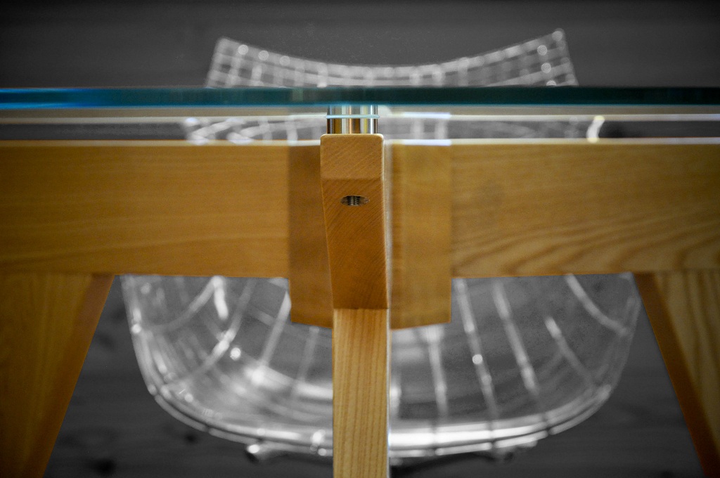 Costituito da una struttura in legno di frassino con linee molto essenziali, completato da un piano in cristallo temperato fissato alle gambe attraverso dischi di acciaio incollati a freddo.